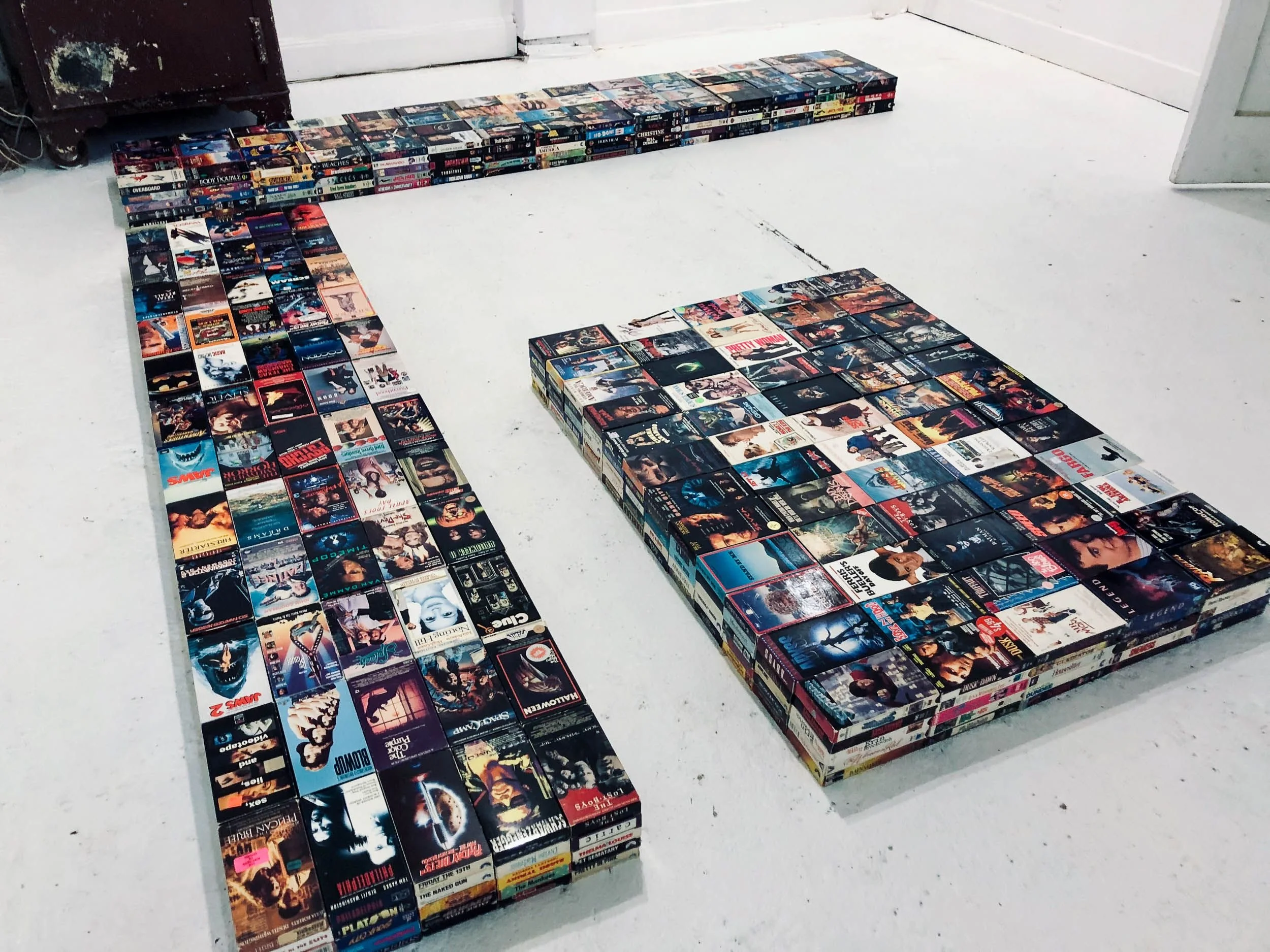 With the VHS tape, the viewer gained control of playback in their home. Thompson found comfort in collecting and organizing VHS tapes; movies became a way of making sense of his world. Moreover, multiple viewings of the same film shifted his relationship with the characters. Their fictitious lives and experiences became his shared reality. Through image and sculptural appropriation, Thompson emphasizes how cinematic commodification creates reality as a "multiverse" of narratives in the viewer's mind.