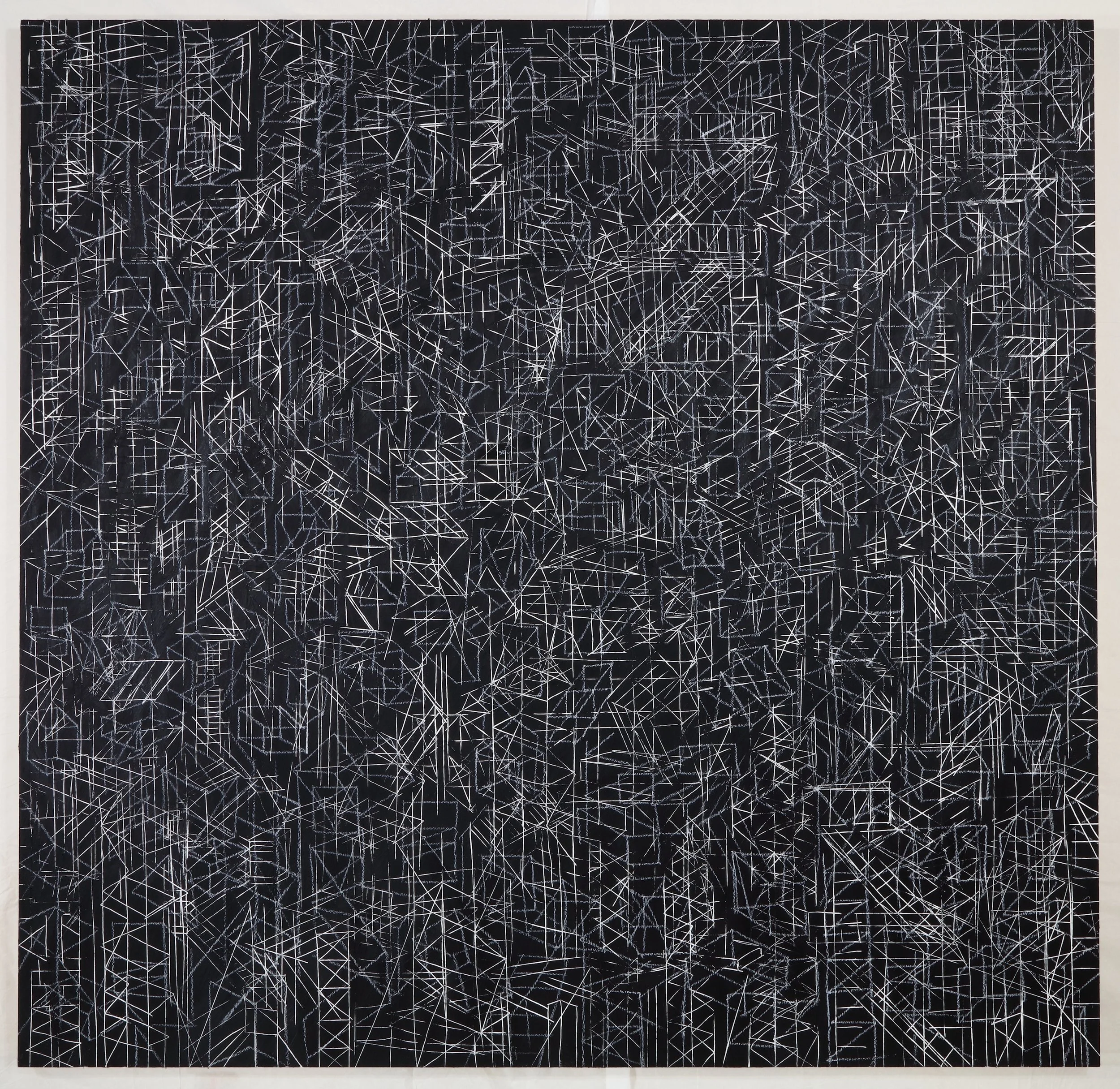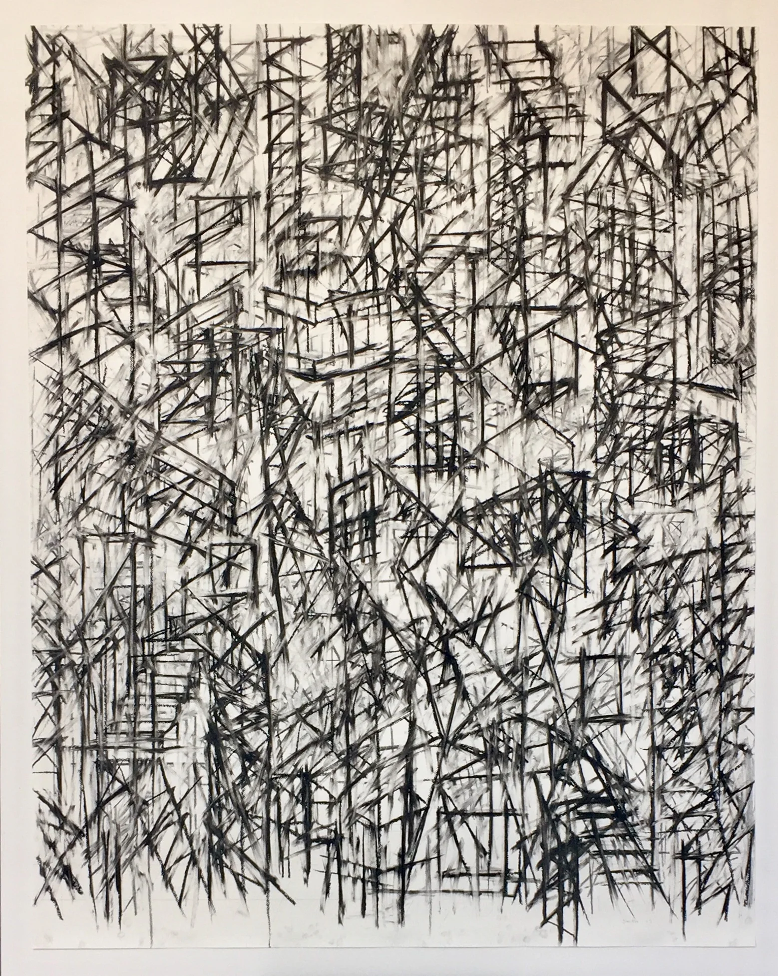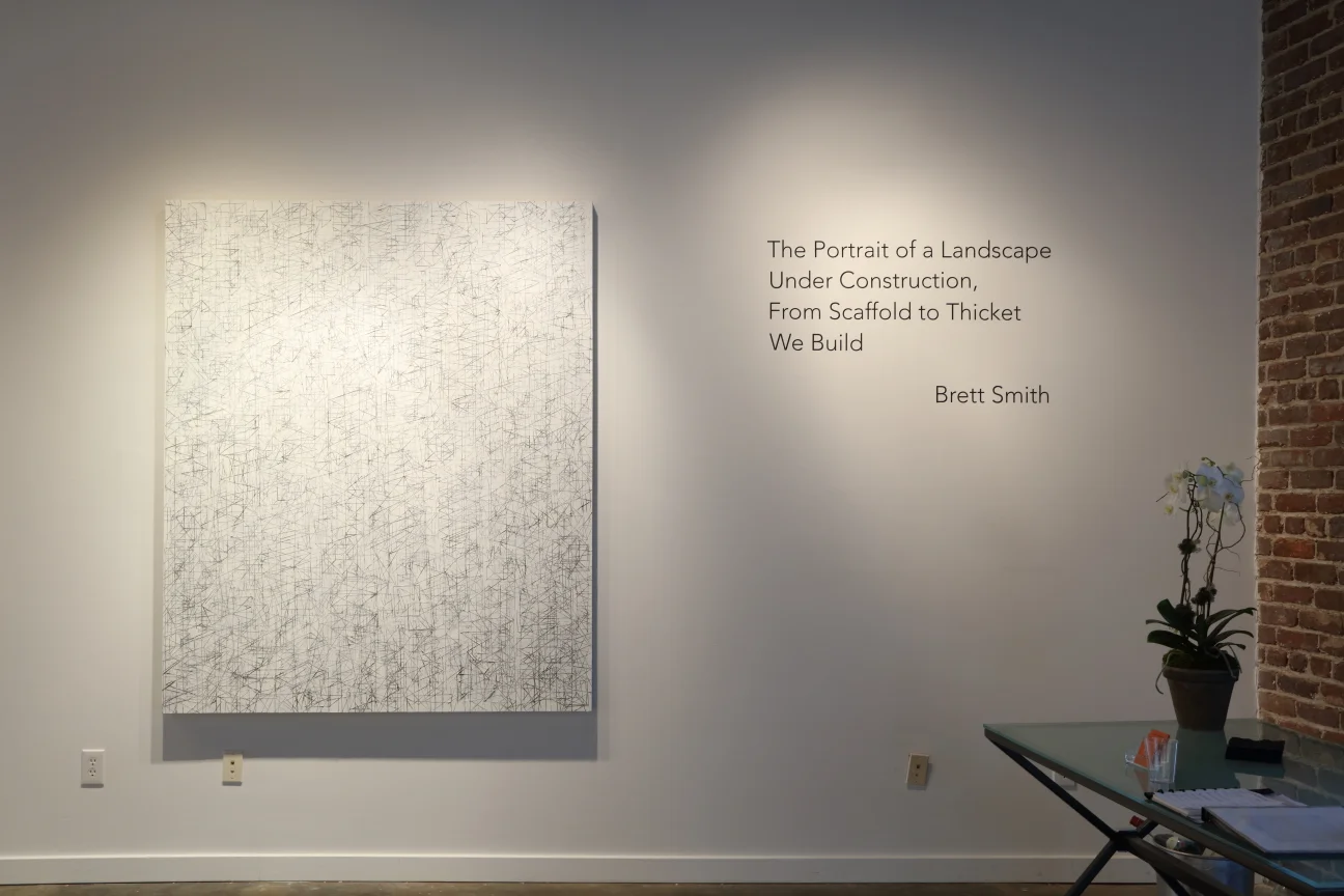 Sandler Hudson Gallery is thrilled to present the latest body of work by Brett Smith. The portrait of a landscape under construction, from the scaffold to thicket we build explores our interactions with nature via complex, layered drawings. The starting point for this work is the tension between urban expansion and the parallel struggle of the natural world to grow and flourish. These sizable drawings on panel are initially overwhelming: hints of scaffolding and construction cranes draw the viewer in, and the complexities of Smith’s process invite us to stay and create our own understanding.