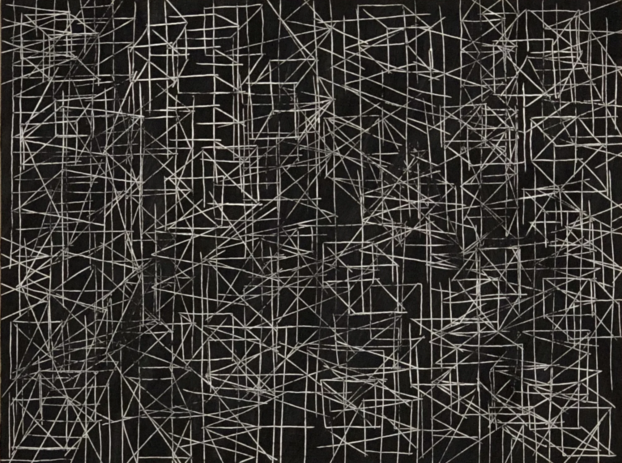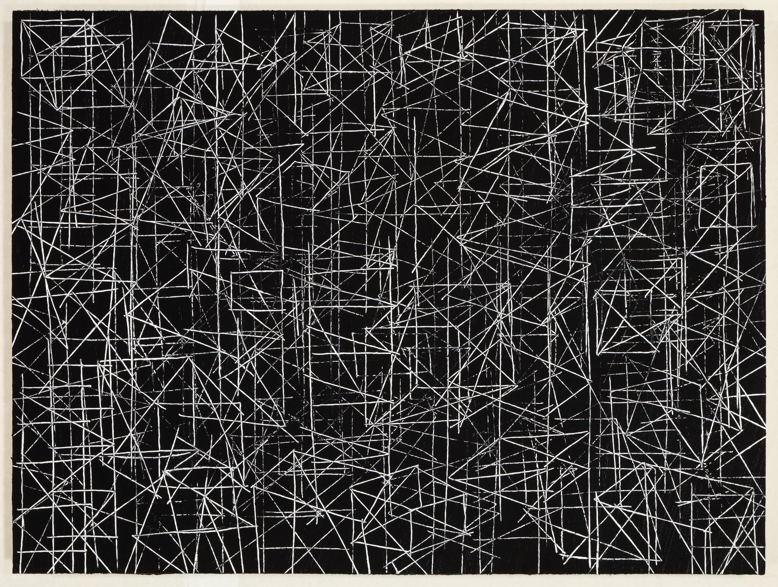 Smith’s work is visually sharp and direct. Using tools to cut into the painted layer of his panels, the exploration of line becomes literally nestled within the wax, oil paint and oil pastels that comprise his surfaces, which are often repainted and reworked. The result is an unmistakably human-made tangle of lines and intersections of varying depths and contrasts. The patterns reference blueprints, they evoke the feeling of a pedestrian surrounded by construction. Sometimes we see cranes, sometimes power line towers, but always a certain entanglement that feels wilder than two-by-fours and steel beams.
