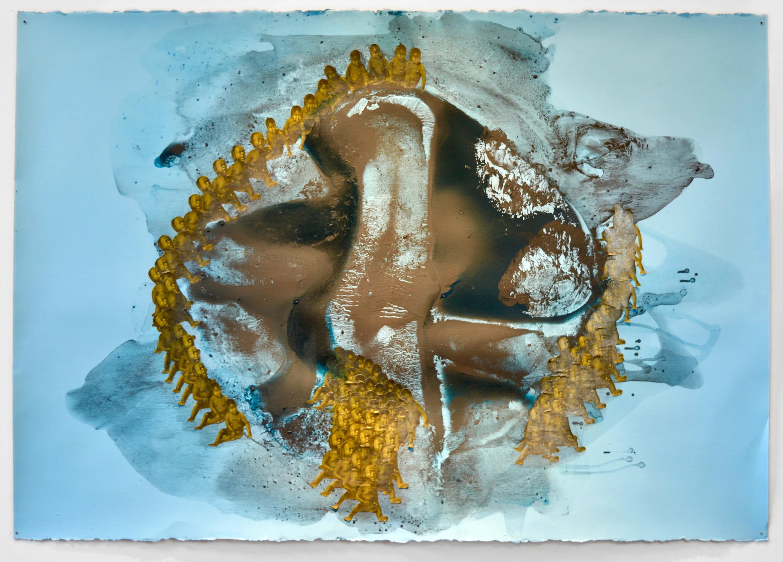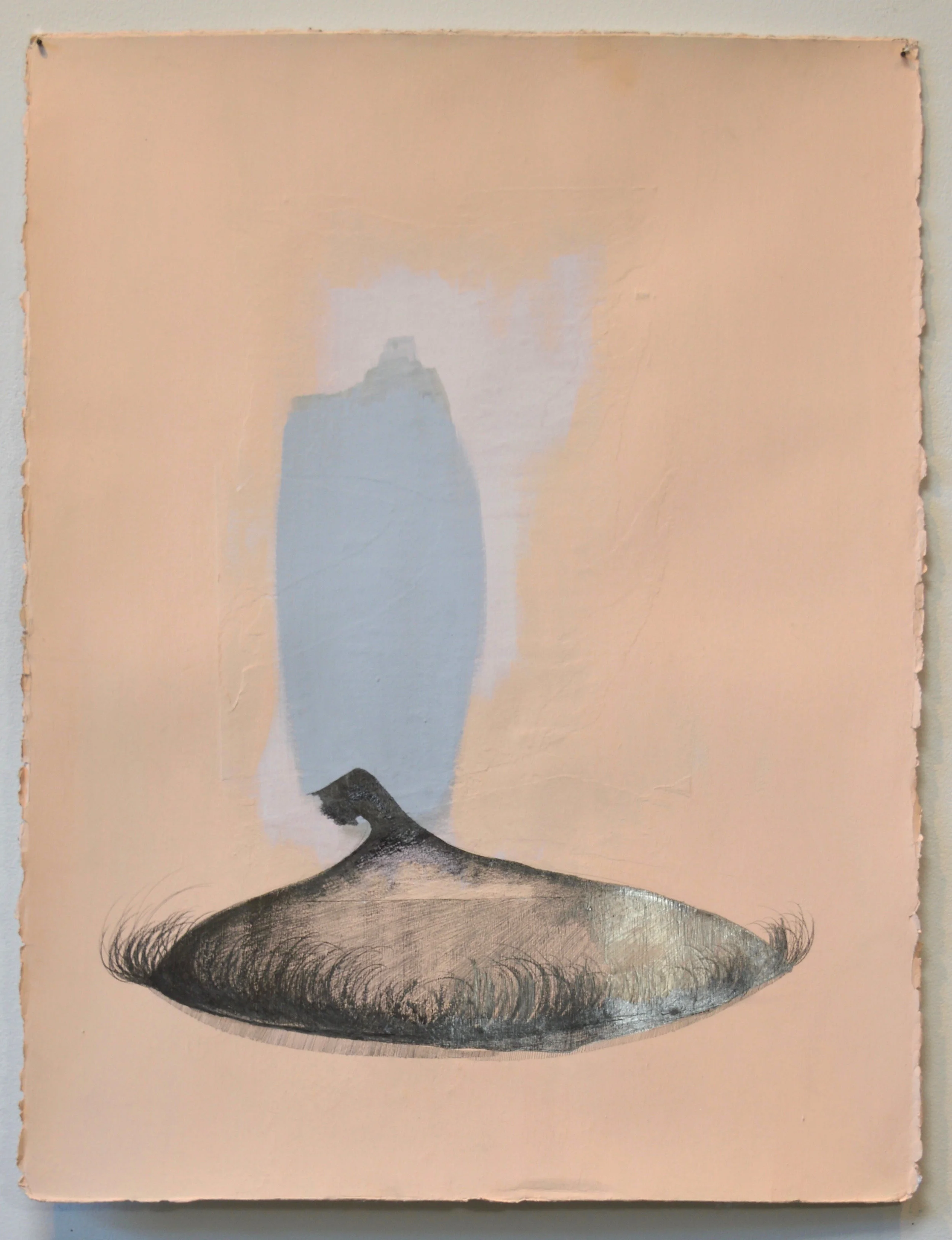 In terms of their approach, William Downs and Yanique Norman rely on the figure as foundation; the two equally accomplish a mixture of formal and surreal elements, consequently producing an alternate, subconscious-driven reality where line becomes more infinite than itself. Operating within his own psychology, Downs’ figurative work is driven by characters engaged in a constant state of motion. The dream-like bodies and landscapes that he builds through the layering of lines portray a movement that transcends the human, becomes scenic, and ultimately straddles the line between waking and fantasy. Similarly, Norman implements figural components in illustrating the rough and turbulent emotional landscapes of the black subconscious mind. She introduces the experimental use of collage and gouache that slowly dissipate from drawn bodies, transforming her emotionally charged yet simplistic figures into an abstract hybrid of the mythological and the fantastical. Undoubtedly, the methods both Downs and Norman practice in order to achieve a physical manifestation of thought far surpass conventional applications of the drawn line.
